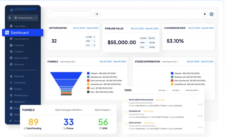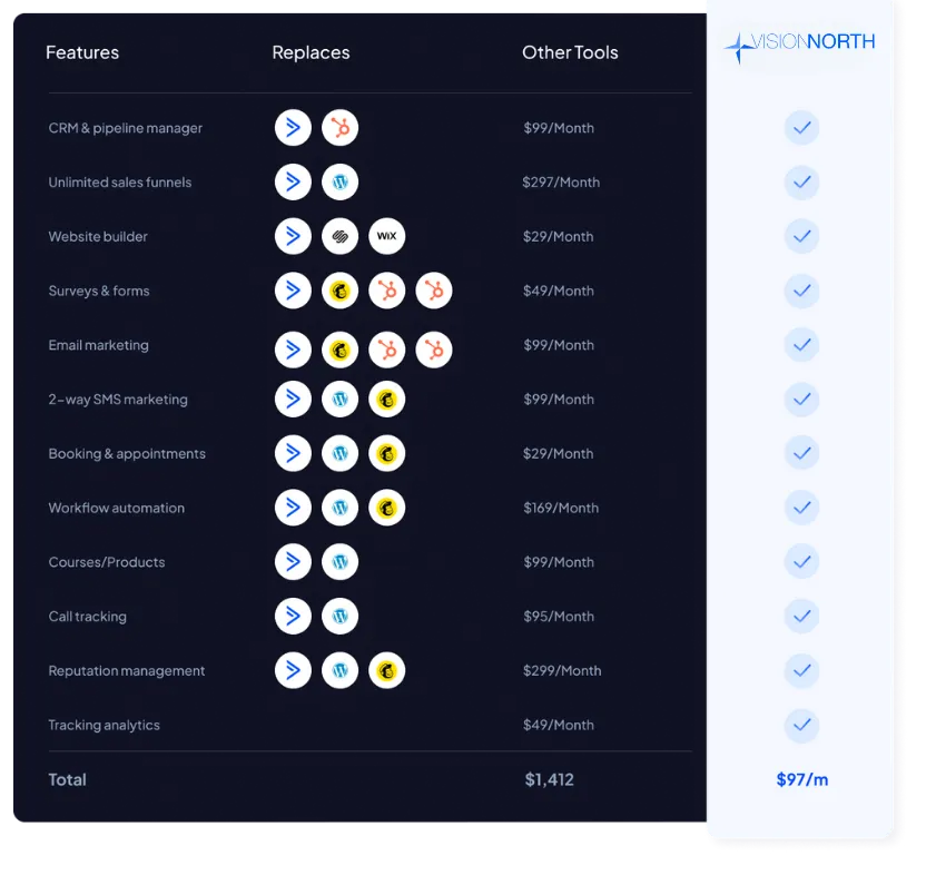 Sí. visionnorth es un "Todo-en-Uno" nativo. No es una colcha de retazos conectada con cinta adhesiva. El CRM, el Email Marketing, el Constructor de Embudos, log agentes con IA, chats con IA, la plataforma de ADS y el Calendario "hablan" el mismo idioma, lo que significa que tus automatizaciones funcionan sin romperse y sin pagar 4 facturas distintas a fin de mes.